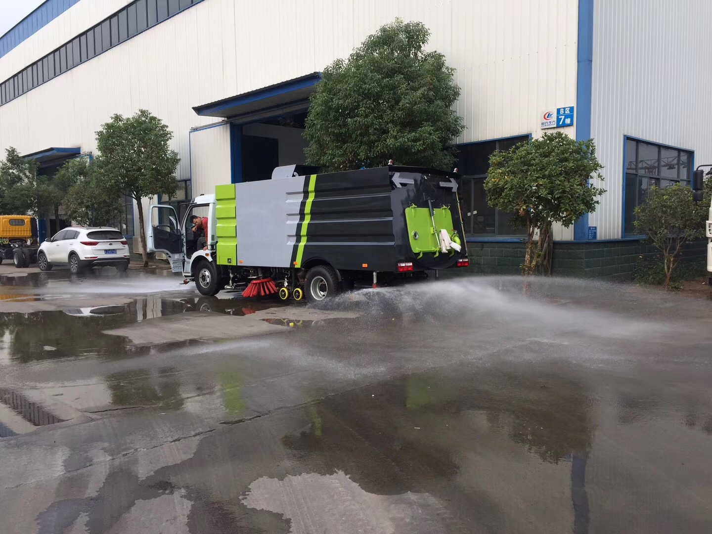 1、左右立掃為雙掃盤,掃刷上加裝噴水裝置,用于噴霧降塵。左右立掃分開,可實現(xiàn)右掃和全掃等不同的作業(yè)模式。
